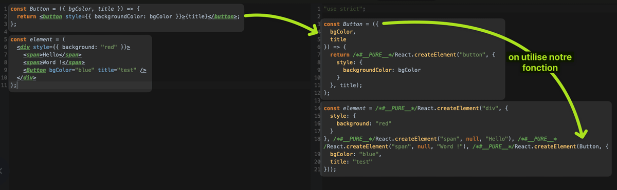 Donc maintenant je vais créer un petit composant button. Celui-ci va pouvoir être appelé partout exactement comme un élément HTML. Il est représenté par une fonction et les paramètres qui lui sont donnés.