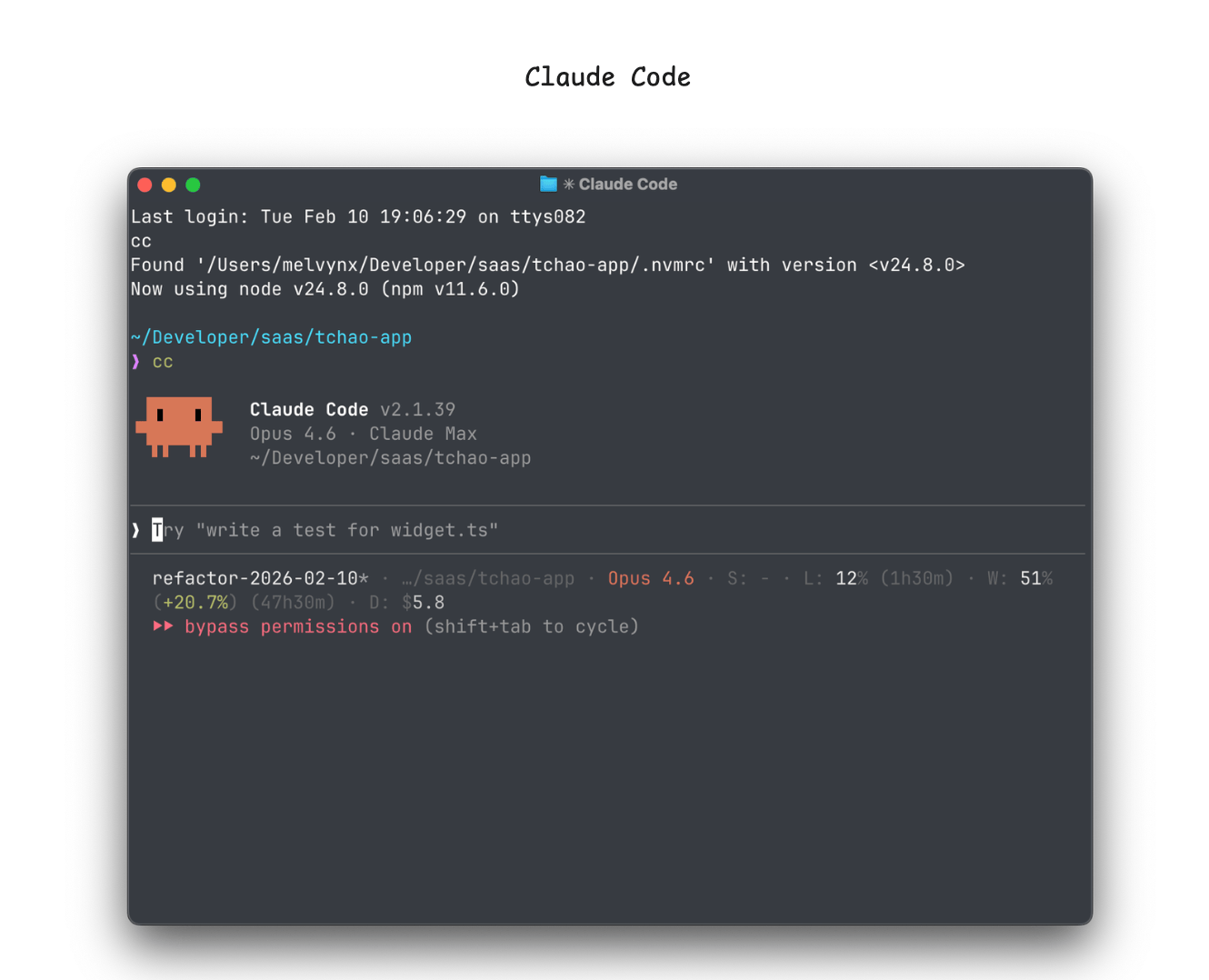 cc # alias pour claude --dangerously-skip-permissionsClaude Code se lance, lit mon CLAUDE.md, et il a tout le contexte du projet.