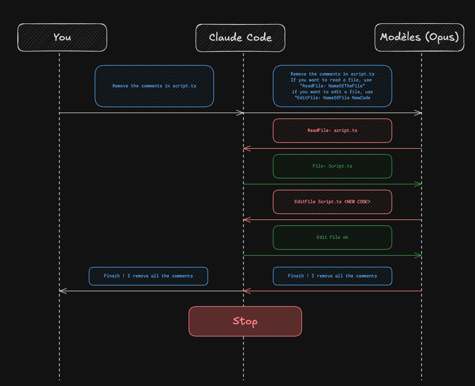 C'est un ping-pong entre le modèle (l'intelligence) et Claude Code (le logiciel qui exécute les actions). C'est ça, le fonctionnement agentique.