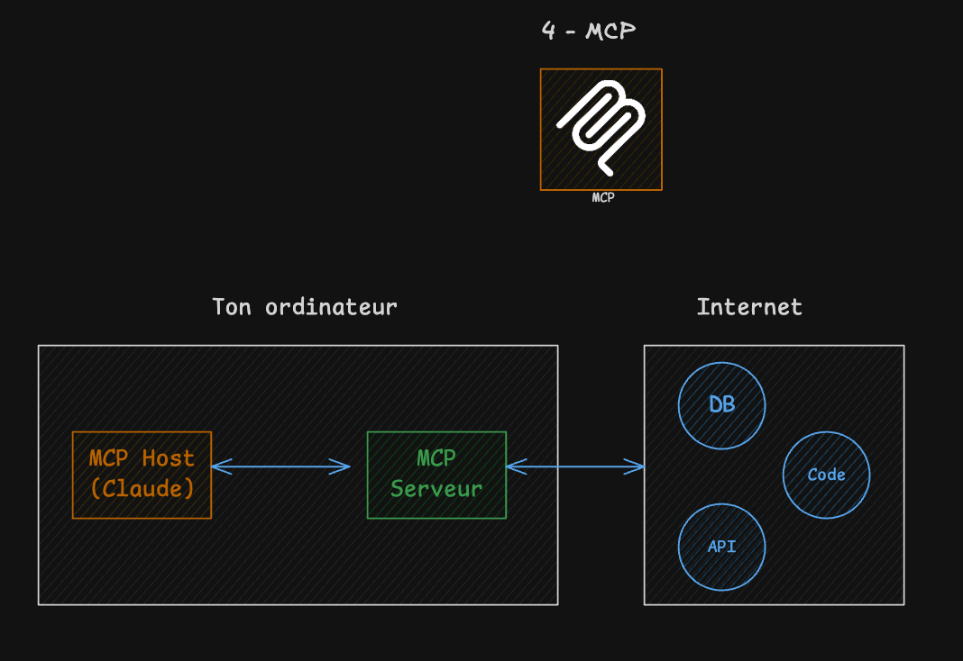 Par défaut, Claude Code a ses outils intégrés (bash, edit, read...). Avec MCP, tu ajoutes des outils supplémentaires.