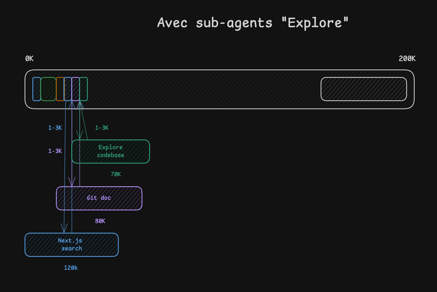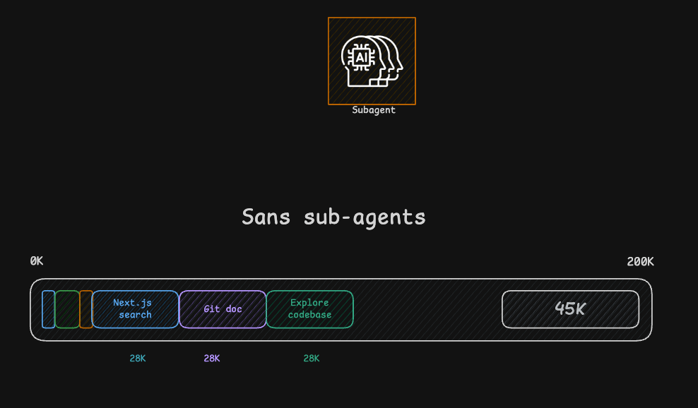 Pourquoi c'est important ? Imaginons que tu demandes une recherche sur les taxes auto-entrepreneurs en France. Sans subagent, l'IA va lire 10 pages web (28000+ tokens chacune) et brûler tout son contexte. Avec un subagent, il lance un mini-agent qui fait toute la recherche et lui retourne un résumé de 500 mots. Contexte préservé.