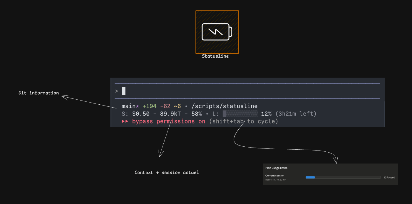 La statusline c'est la petite barre d'informations en bas de Claude Code. Tu peux la customiser pour afficher ce que tu veux : dossier actuel, modèle, contexte utilisé, coût de la session...
